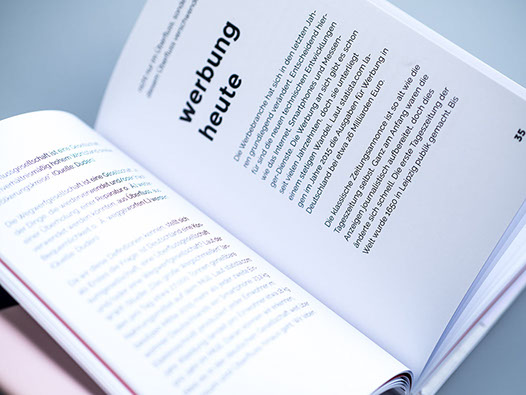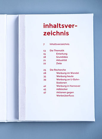 This page shows my bachelor thesis. I made it into a book that has an DIN A5+ format and has a coloured dust jacket. The layout of the book is very simple. Each chapter starts with a highlighted teaser text in red, the main colour of the project. The font is the same as I used for the application. Pictures are highlighted and are not "fitting" into the grid.